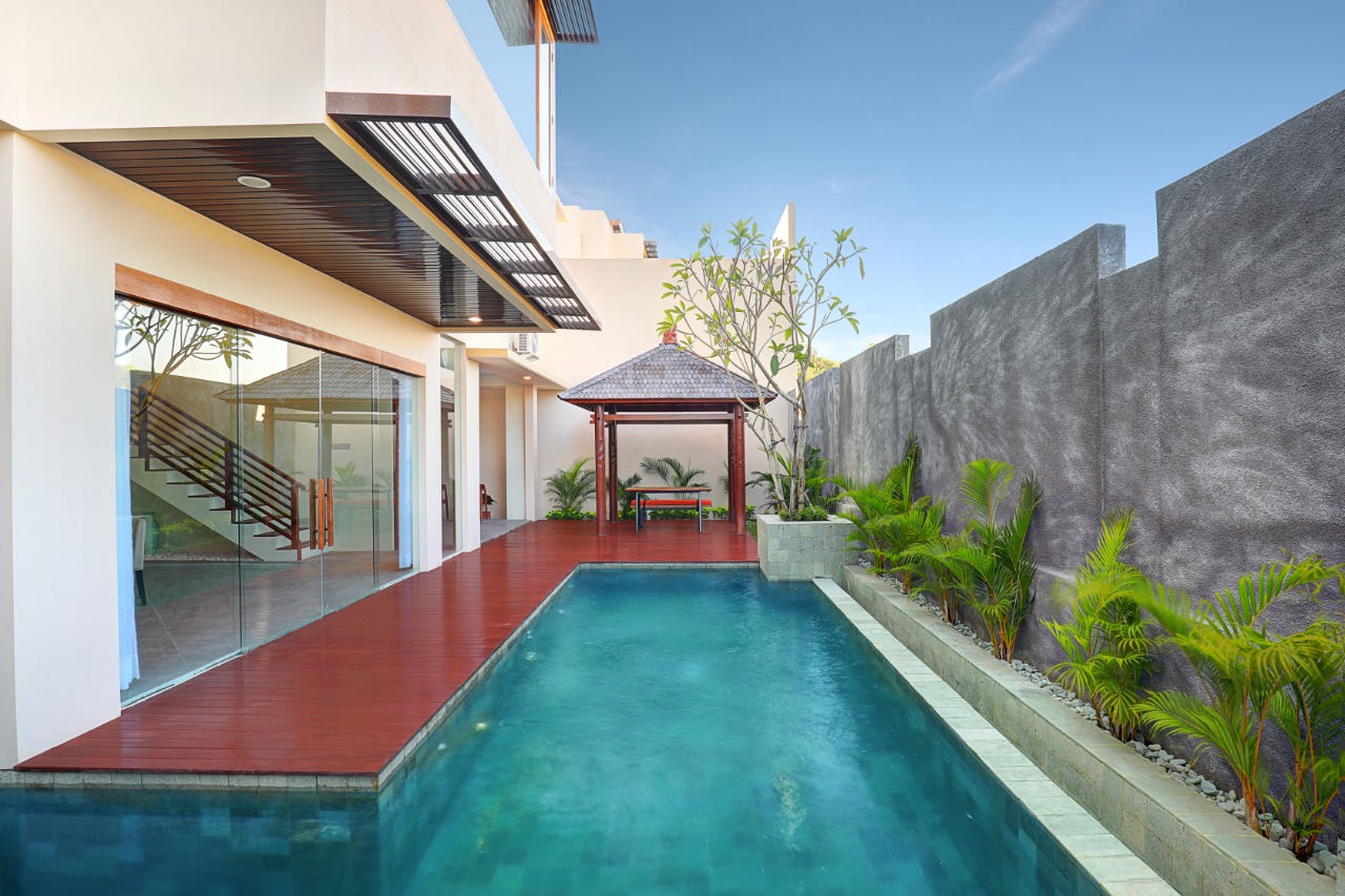 Villa compound with 2 bedrooms and 3 bedroms villa private pool 🛀 bathtub. modern style, has offered 🅿 parking area 📶 Wi-fi , 3 floors, Kitchen , Rate: - Rp 2.200.000 / night